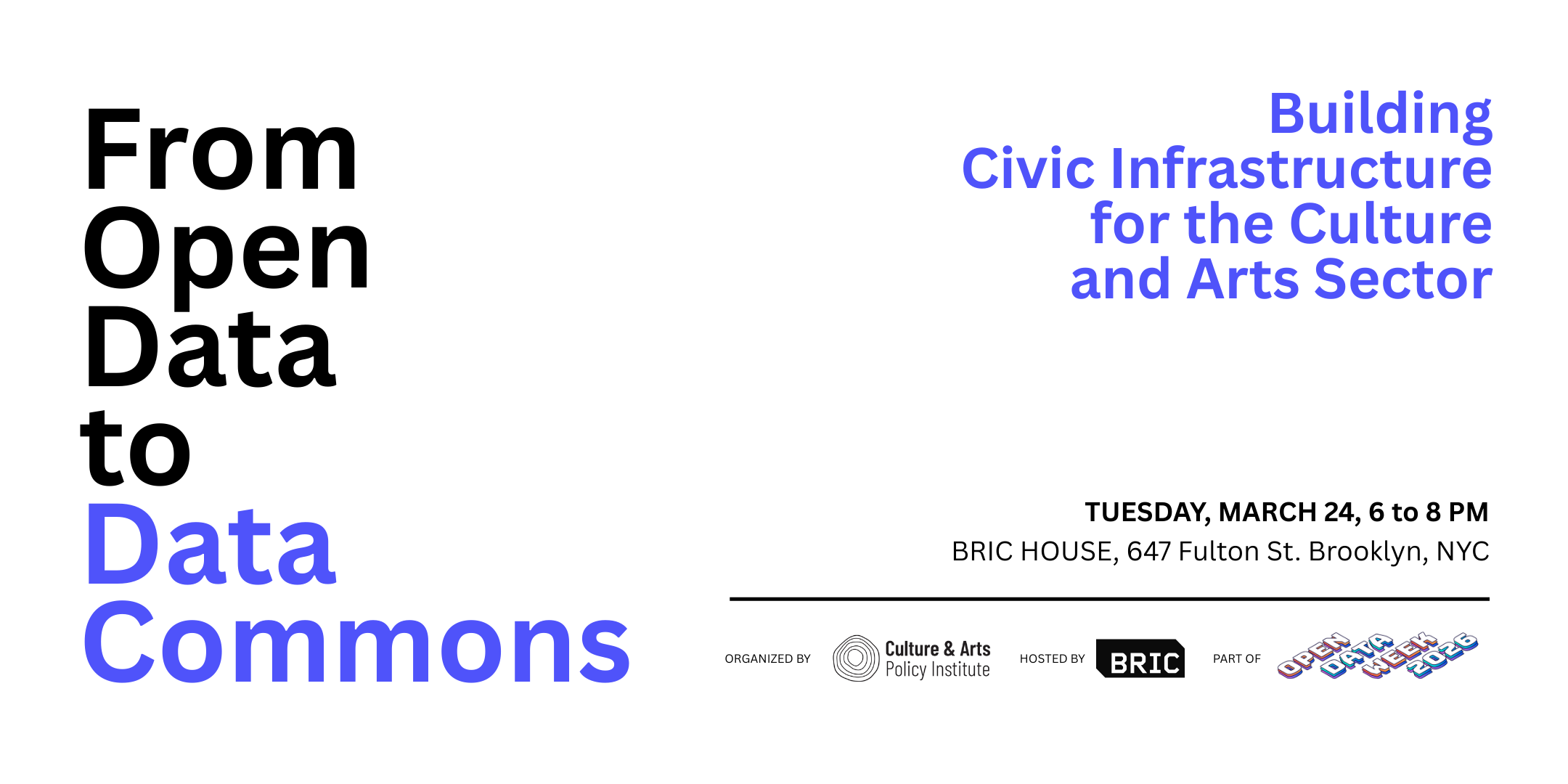 From Open Data to Data Commons: Building Civic Infrastructure for the Culture and Arts Sector March 24 @ 6:00 pm - 8:00 pm BRIC 647 Fulton Street, Brooklyn, New York, United States of America What if the problem isn’t a lack of data, but a lack of infrastructure...