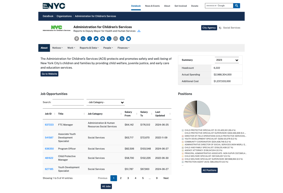 The WeGovNYC Databook (https://databook.wegov.nyc/) is a data pipeline that indexes, normalizes, and republishes over 50 NYC Open Data datasets into a single interface that offers in-depth profiles of City agencies, public schools, civil service titles and more.